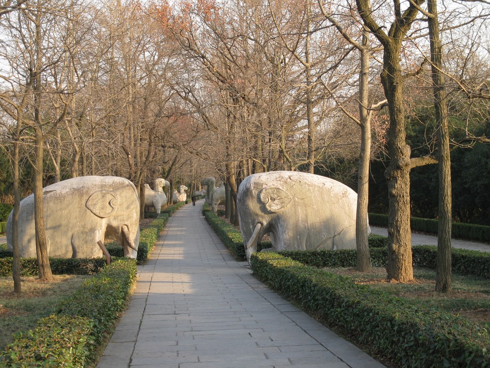 按照正常的入園路線,從四方城開始。四方城內(nèi)巨大的石碑首先給人強烈的視覺沖擊,碑的高度約3層樓房,一個巨型石龜馱負,據(jù)說是目前世界上最大的石碑。幾乎不能想象當時是如何把這石碑運到山上,又如何樹立起來的?或許借助杠桿和三腳架滑輪之類的工具吧。碑頂云龍紋裝飾,碑文為朱棣手書,吹噓太祖功德。朱棣的楷書非常漂亮,顛覆了我對他的一貫武夫梟雄印象。接下去是約一華里石象路,兩側(cè)排列麒麟、大象、駱駝,獅等雕像,數(shù)量眾多、雕飾寫實精美。走完石象路,就是翁仲道,道旁分列文官武將,應(yīng)該就是這些將領(lǐng)幕僚輔佐太祖光復(fù)漢人河山的吧!不免讓人產(chǎn)生十分敬重之感,更覺高大古樸!以上是神道部分。
