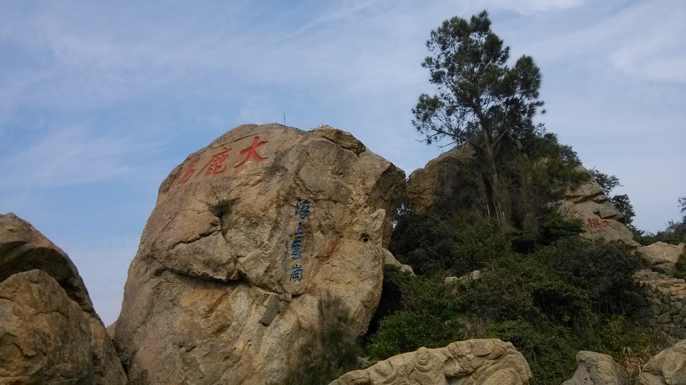 這是一艘鐵板船,船的寬度大約只能并排橫放兩張辦工桌,長度略長于常見的集裝箱卡車,對于大海而言,這是非常小的船了。船頭是一個小小的甲板,中間是下陷的船艙,船尾小小的甲板上立著一個小小的駕駛艙。整個船斑駁不堪,似乎跟船老大一樣年老了。那對情侶坐于船頭,駕駛臺前的小甲板上放置著一個只有大拇指和食指撐開距離高度的小條凳,我們四個就并排坐在這里。機器 “突突”的轟鳴聲中,船緩緩的向大鹿島出發(fā)了。船行了一段距離,看見海面上有霧氣升騰,霧氣不是很高,似乎恰恰遮擋住視線,很遠的海平面是看不清的,稍遠處的海島、陸地上的山、漁船也都在霧中影影綽綽,似在仙境了??上а赝径际菧\海,又正值小潮,海水是泥漿般的渾黃,并沒有見到蔚藍的模樣。迎著風,船兒兩側帶起泛著白色泡沫的低低的“人”字形浪花,忽高忽低地行進。孩子們歡聲笑語,我和妻子瞇著眼享受著搖籃般的搖晃。約莫過了一個小時,滿眼蒼綠的大鹿島已經(jīng)在眼前了。