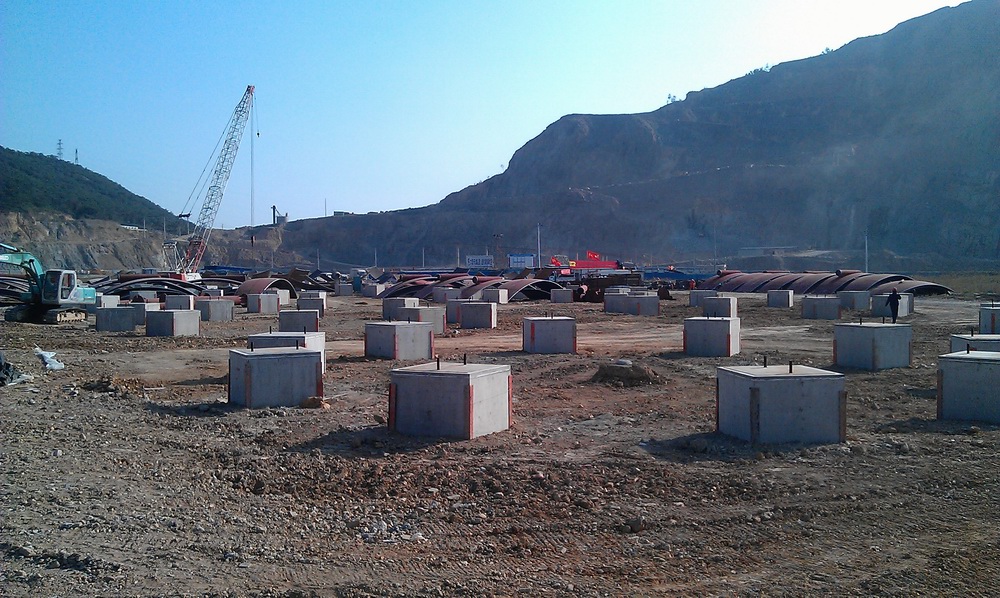 項(xiàng)目部承建的一階段工程位于寧波北侖區(qū)青峙開發(fā)區(qū)內(nèi),共有丙烯罐組12個(gè)球罐基礎(chǔ)與混合碳四罐組10個(gè)球罐基礎(chǔ)。其中丙烯罐組每個(gè)罐基礎(chǔ)上均勻分布10個(gè)短柱,混合碳四罐組每個(gè)罐基礎(chǔ)12個(gè)短柱。每只短柱上都預(yù)埋2個(gè)M48地腳螺栓。