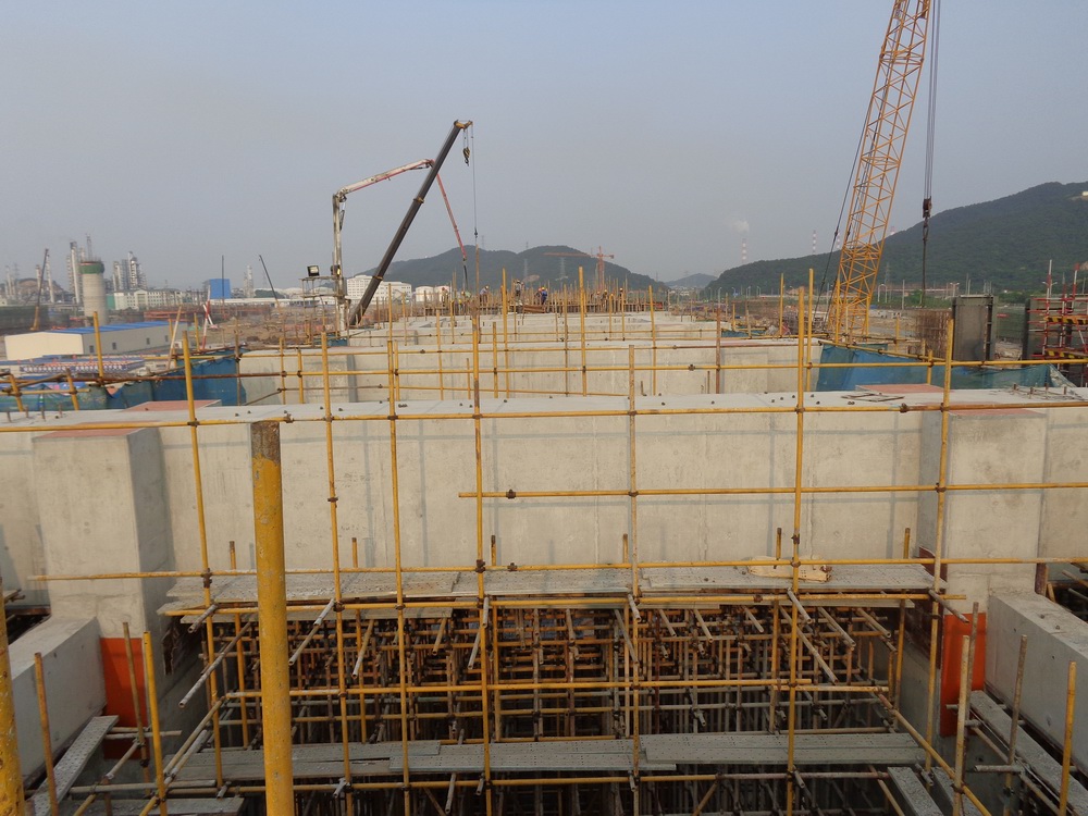 PDH裝置是寧波海越丙烷與混合碳四利用項(xiàng)目的核心裝置,而反應(yīng)框架是PDH裝置標(biāo)志性的建筑,自2013年1月16日開(kāi)工以來(lái),一直受到業(yè)主、監(jiān)理、EPC的高度關(guān)注,它全長(zhǎng)114米,寬26米,高33.25米(其中基礎(chǔ)高13米),具備柱子(1000×2700)、梁(1500×2600)截面大,支模架高度高(13.411米),承重架搭設(shè)量大,地腳螺栓和預(yù)埋件數(shù)量多且大(預(yù)埋件單塊最大重1.5t)的特點(diǎn),同時(shí)涉及到高大模板及其承重體系、地腳螺栓安裝、大體積混凝土澆筑等多項(xiàng)專(zhuān)項(xiàng)施工方案的編制以及論證,且受施工工期緊、作業(yè)面及操作面狹小、施工過(guò)程中雨天頻繁、施工工藝操作難度大等因素影響,但寧波海越項(xiàng)目部堅(jiān)持發(fā)揚(yáng)“一家人、一條心、一股勁、一個(gè)目標(biāo)”的精神,項(xiàng)目部上下齊心合力克服重重困難,積極調(diào)動(dòng)各方資源力量,與班組緊密合作,精心組織,合理安排,不僅保證了反應(yīng)框架的進(jìn)度控制點(diǎn),而且施工實(shí)體質(zhì)量和表觀質(zhì)量也得到各方的高度評(píng)價(jià)。反應(yīng)框架優(yōu)質(zhì)的施工質(zhì)量在施工過(guò)程中曾多次作為樣板工程供海越丙烷與混合碳四利用項(xiàng)目各總包單位和分包單位觀摩的對(duì)象,且2013年4月我項(xiàng)目部憑著反應(yīng)框架的出類(lèi)拔萃的混凝土質(zhì)量以及高度精準(zhǔn)的地腳螺栓預(yù)埋工作,被評(píng)為2013年浙江省工程建設(shè)優(yōu)秀質(zhì)量管理小組。